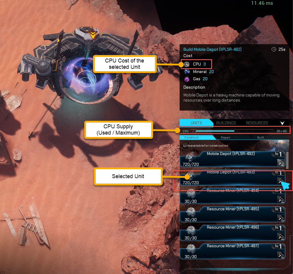 Constructing and controlling a [Unit ](https://wiki.pulsar.game/assets/units)requires a certain amount of CPU. Different types of Units may have different CPU requirements. Also, as Units level up they will generally require more CPU.